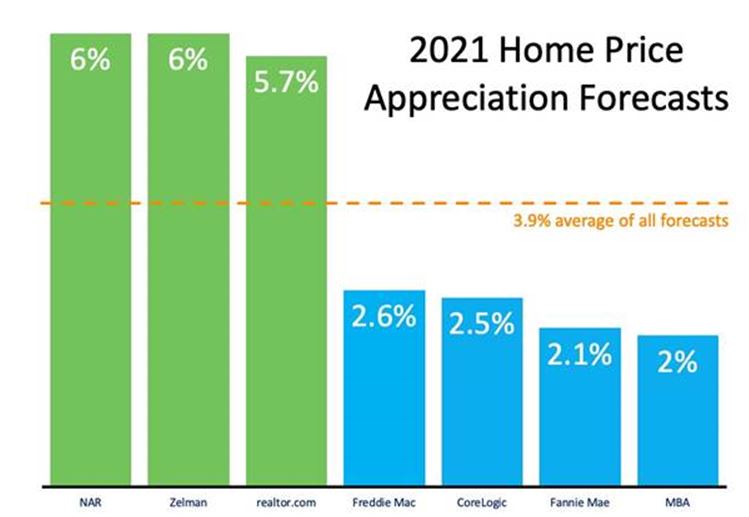 Low mortgage rates have driven buyer demand over the last twelve months. According to Freddie Mac, rates stood at 3.72% at the beginning of 2020. Today, we’re starting 2021 with rates one full percentage point lower than that. Low rates create a great opportunity for homebuyers, which is one reason why demand is expected to remain high throughout the new year. Taking into consideration these projections on housing supply and demand, real estate analysts forecast homes will continue to appreciate in 2021, but that appreciation may be at a steadier pace than last year. Here are their forecast: